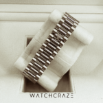 Its dial is chocolate brown. Sunray finish illuminates rose gold hour markers and hands. The watch’s 12 and 3 o’clock day and date windows improve functionality.
