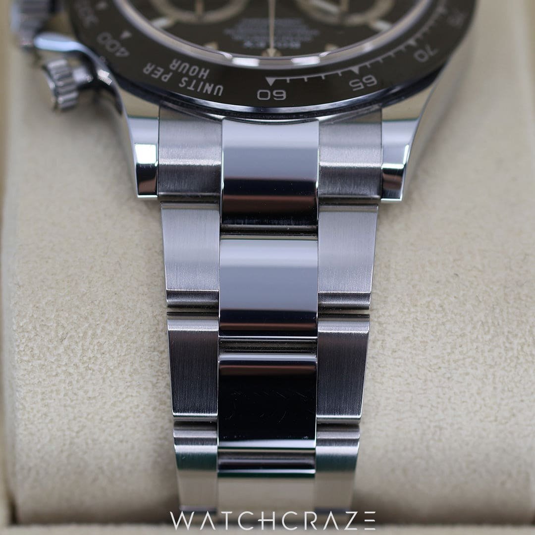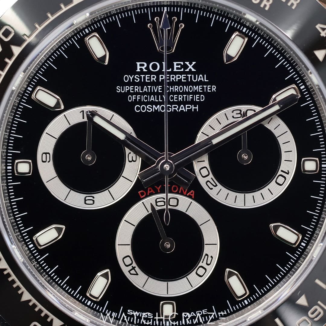 The dial of the Daytona 116500LN is a perfect blend of functionality and style, with its clean, easy-to-read chronograph display. The black Cerachrom bezel, made from Rolex’s proprietary ceramic material, is not only visually striking but also extremely durable, resistant to scratches and UV rays. The bezel is marked with a tachymetric scale, a crucial tool for measuring average speeds, making this watch a quintessential choice for motorsport timing.